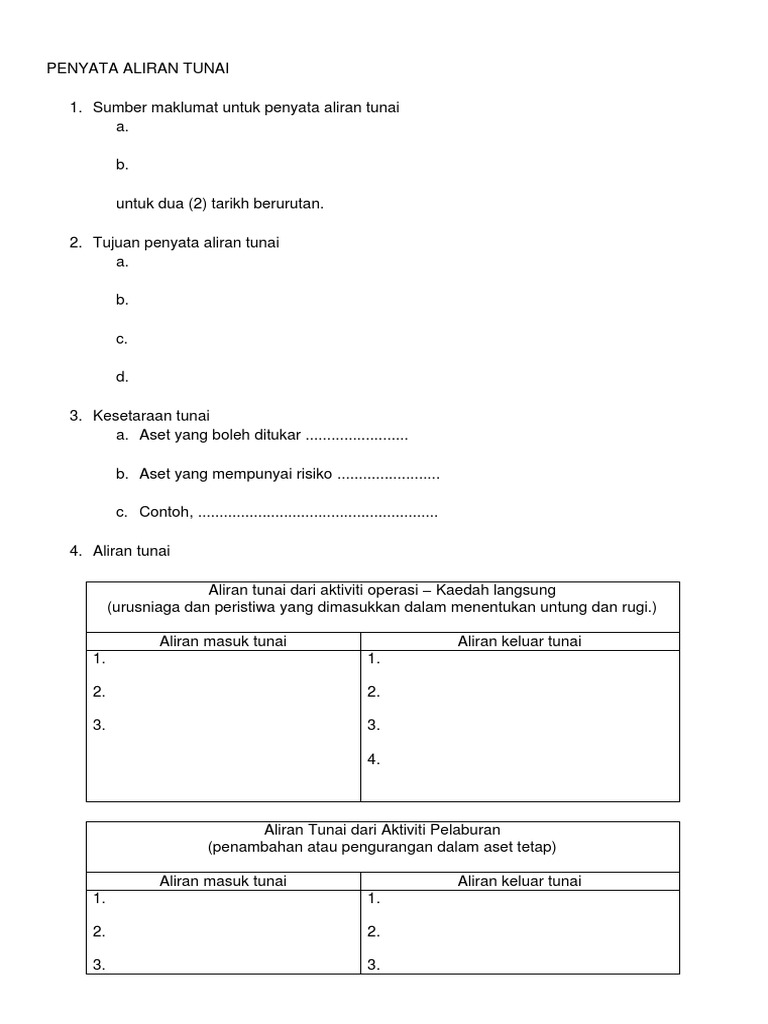 Related : Contoh Penyata Aliran Tunai : Penyata Aliran Tunai Cara Menyiapkan Penyata Aliran Tunai - Pelabur dan pengendali perniagaan sangat mementingkan cf kerana ia adalah nadi kehidupan syarikat..